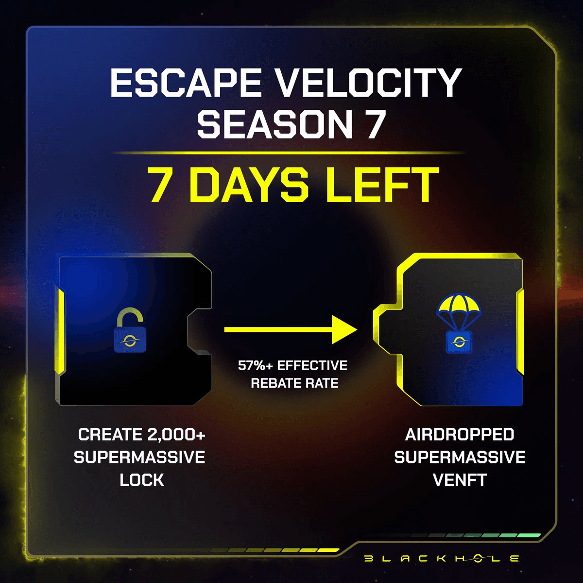 **Final week to participate in Escape Velocity Season 7** The seventh season of Escape Velocity ends January 29th at 12:00 PM UTC. Participants have one week remaining to qualify for rewards. **Key details:** - Create supermassive locks worth 2,000 veBLACK or more - Qualify for airdrops distributed at season end - Current rebate rate: 57% - Total season allocation: 8,000,000 veBLACK in rebates The program rewards users who lock veBLACK tokens by returning additional veBLACK based on the rebate percentage. With rebates currently at 57%, participants receive more than half their locked amount back as rewards.