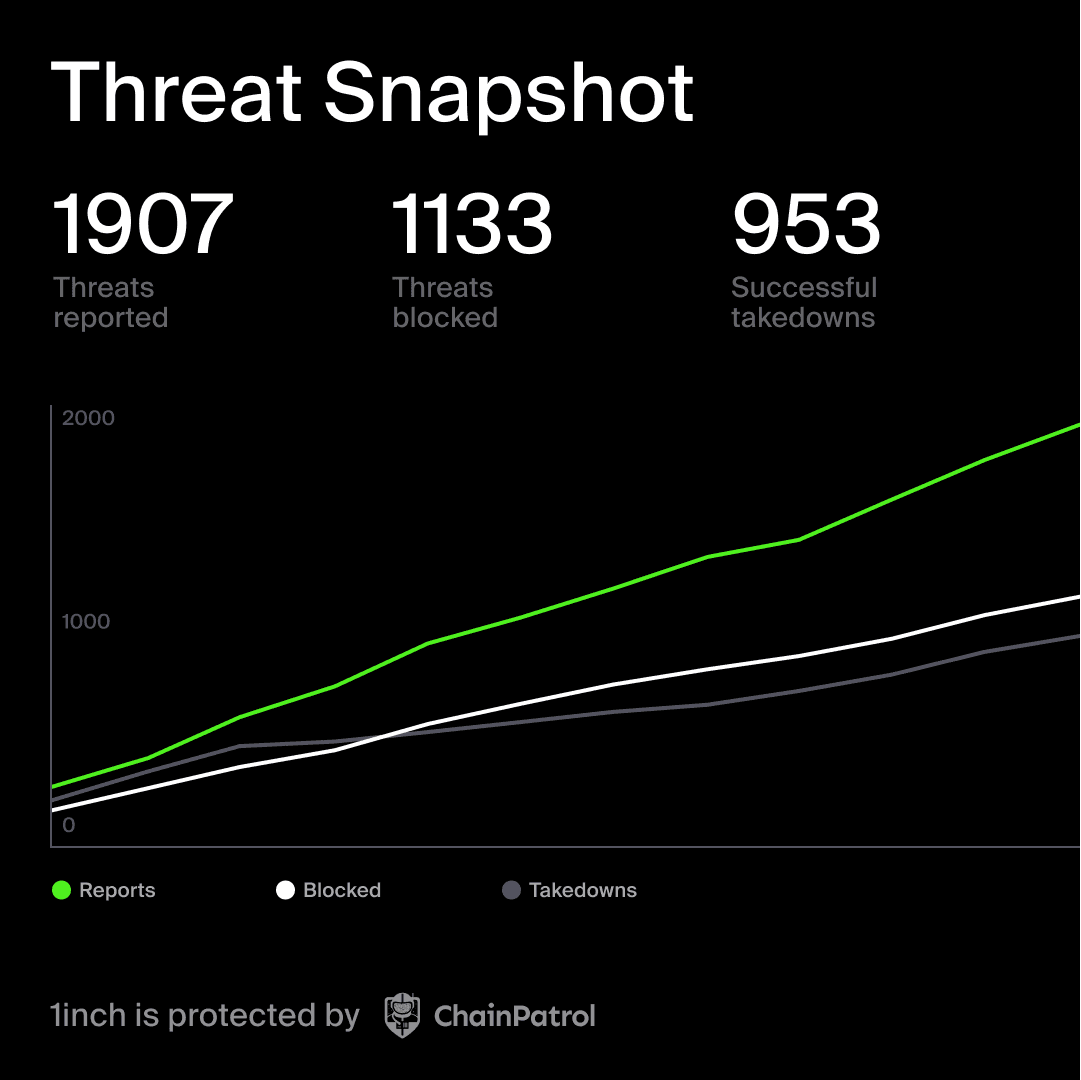 **1inch has strengthened its security infrastructure through a partnership with ChainPatrol** to protect users from malicious actors exploiting the 1inch brand. The collaboration focuses on: - Taking down fake dApps - Blocking phishing attempts - Preventing brand exploitation The partnership delivered measurable results throughout 2025, demonstrating the effectiveness of collaborative security approaches in DeFi. This initiative builds on 1inch's previous security efforts, including joining the [Beacon Network](https://beacon.network) to track illicit funds and enhance real-time threat detection across the ecosystem.