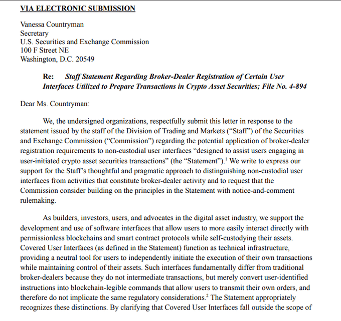A coalition of 30+ organizations, led by the DeFi Education Fund, has submitted a formal letter to the SEC requesting official rulemaking on non-custodial interfaces. **Key Points:** - The SEC recently acknowledged that non-custodial interfaces are not broker-dealers - Coalition seeks to cement this recognition through formal regulatory process - Move aims to provide legal clarity for DeFi protocols and developers **Background:** This follows the SEC's June 2025 withdrawal of proposed DeFi regulations from the Gensler era, which had created uncertainty around custody and protocol oversight. The coalition's letter can be found at: [DeFi Education Fund](http://defieducationfund.org/docs/executive/coalition-letters/coalition-letter-to-sec-re-ui-staff-statement-april-2026) Formal rulemaking would establish clearer boundaries for DeFi development and reduce regulatory ambiguity.