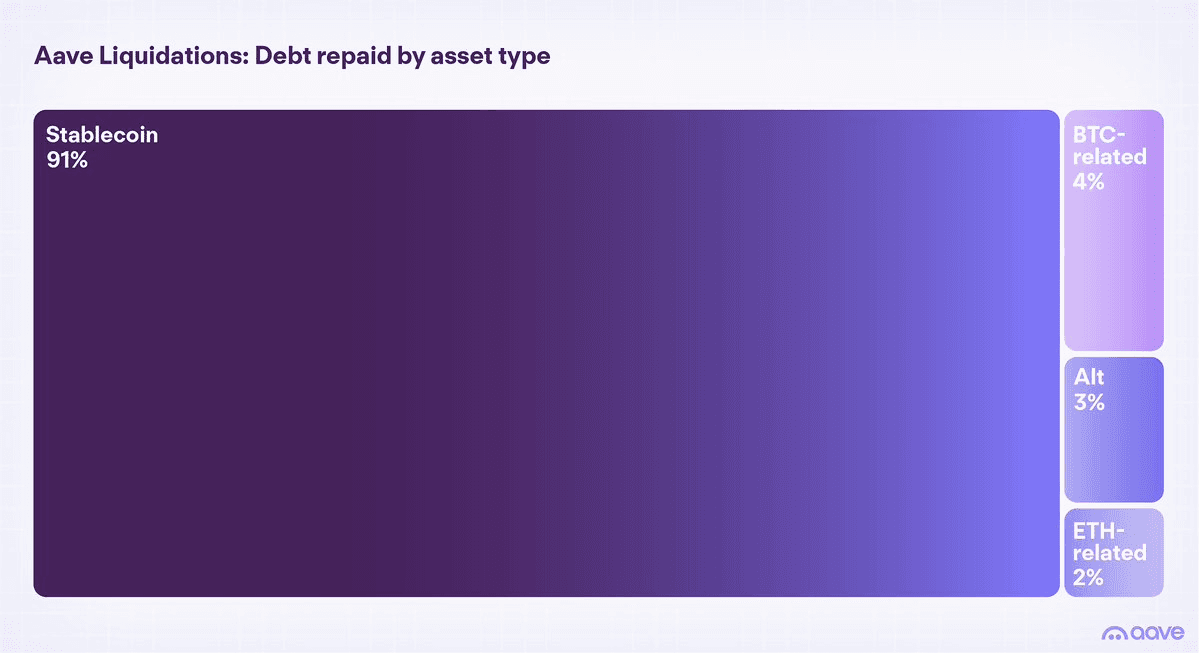 Across all networks, three-quarters of Aave's total liquidation volume (in USD terms) has occurred on Ethereum. However, when measured by the total count of liquidation events, the pattern reverses with non-Ethereum networks accounting for the majority of transactions.