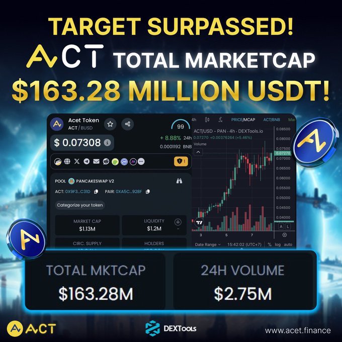 ACT Total Market Cap Reaches $100,000,00 M!! The total value of ACT has surged to $100.56 M Ref :: 16/02/2025 17:01 PM UTC Source :: dextools.io/app/en/bnb/pai… Check the latest price of ACT at: acet.finance Stay up-to-date by following us on X: