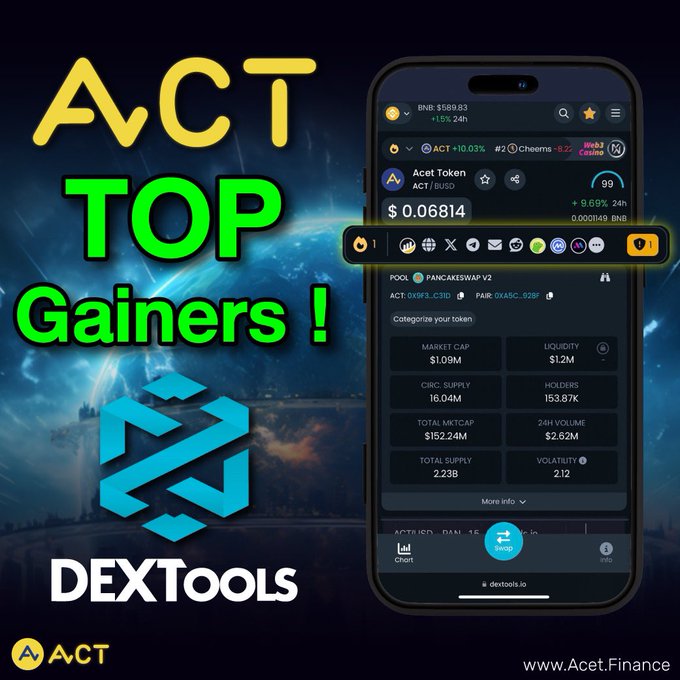 ACT’s strong surge lands itself on Dextools' Number 1 Gainers. Ref. 06/02/2025 03.53 AM UTC Source: dextools.io/app/en/bnb/pai… Check the latest price of ACT at: acet.finance Stay up-to-date by following us on X: x.com/ACTDeFansFi Telegram: