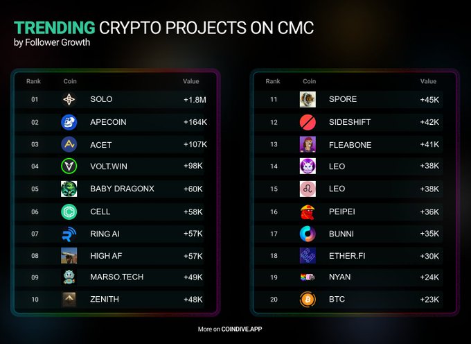Here are the top crypto projects most added to watchlists on CoinMarketCap this week! - #SOLO: +1.8M - #APECOIN: +164K - #ACET: +107K - #VOLT.WIN: +98K - #BABY DRAGONX: +60K Find out what's driving their popularity in the thread 🧵