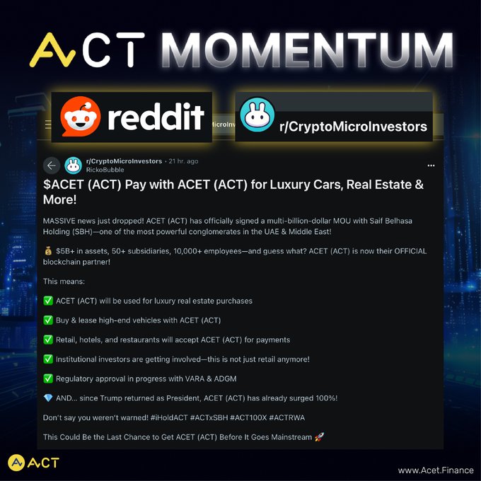 r/MoonshotMillionaires – a channel on Reddit, a social community platform, highlights Acet (ACT) is positioned as a payment innovation within UAE’s $3.9 billion initiative. Source : reddit.com/r/MoonshotMill… Check the latest price of ACT at: acet.finance Stay