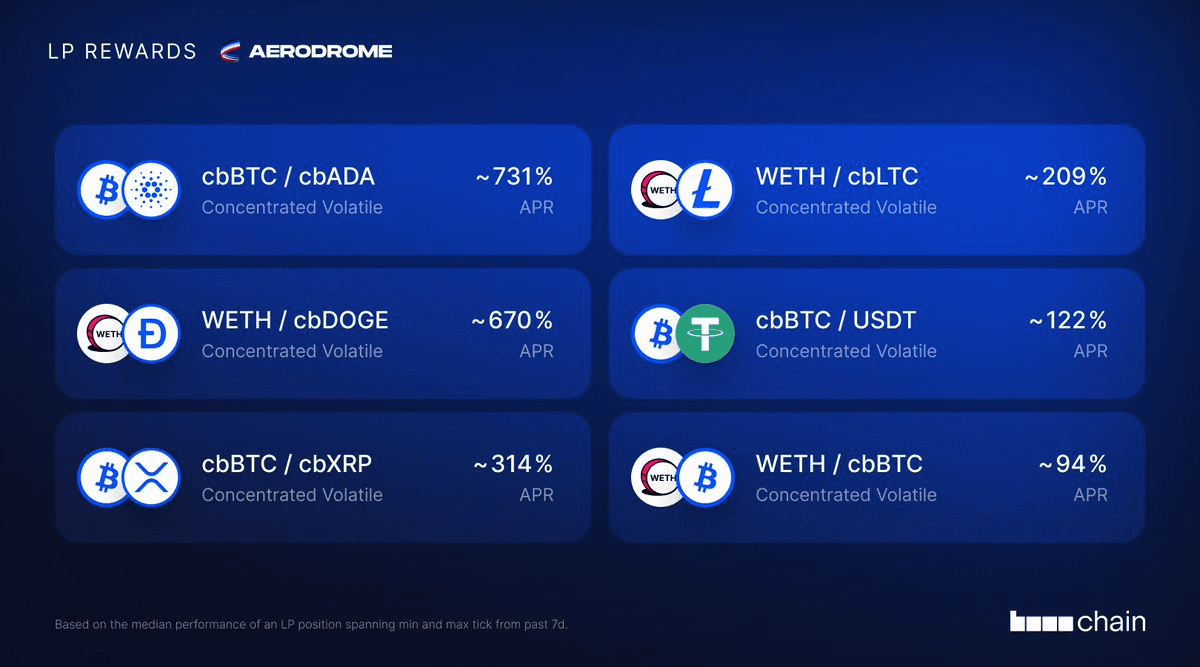 Aerodrome Finance has updated its Slipstream liquidity provider rewards for cbAssets on Base, with rates ranging from 86% to 761% APY. **Top Performing Pairs:** - cbBTC-cbADA: ~761% - cbBTC-cbXRP: ~638% - cbBTC-cbDOGE: ~556% - cbBTC-cbLTC: ~308% - cbBTC-USDC: ~221% - cbBTC-WETH: ~86% The rewards represent opportunities for liquidity providers to earn yields by depositing token pairs into Aerodrome's concentrated liquidity pools. These rates are consistent with previous cbAssets reward cycles, which have maintained similar APY ranges over recent weeks. Aerodrome positions itself as Base's central liquidity hub, using a vote-lock governance model where NFT holders direct token emissions.