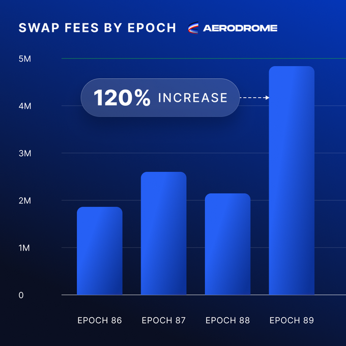 Aerodrome Fees Break Records š Epoch 89 not only had a record volume increase on Aerodrome but also saw swap fees climb by $2.6Mšāa 120% move from the prior epoch marking the highest weekly increase in protocol history. Aerodrome is acceleratingā”