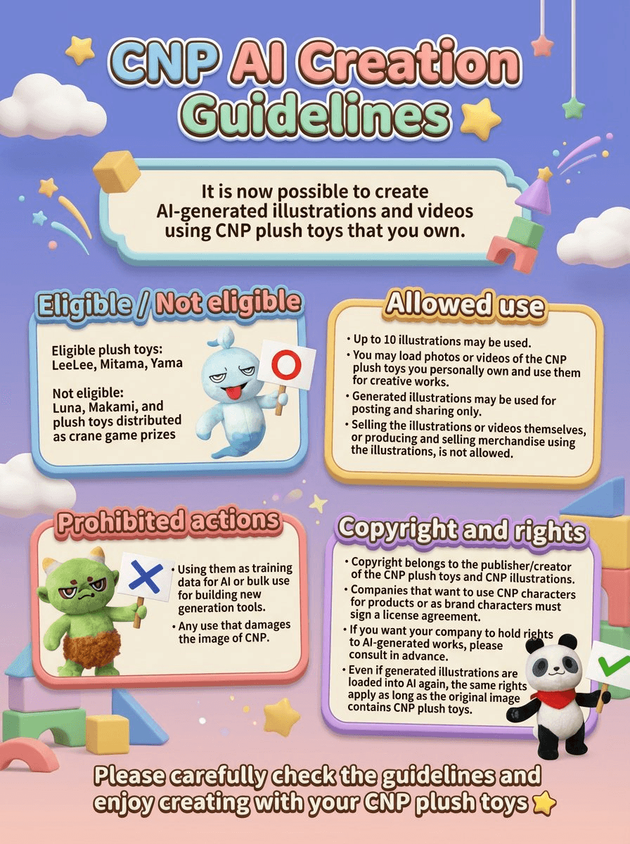 CryptoNinja Partners (CNP) has enabled AI-generated artwork creation for owners of specific plush toys. **Eligible Characters:** - LeeLee the panda - Yama the little oni - Mitama the ghost **Key Requirements:** - Must own the physical plush toy - Can only use photos of plushies you personally purchased - Must follow official guidelines before creating AI works **Resources:** - Shop: [CNP Plush Store](https://shop.cryptoninja-partners.xyz) - Guidelines: [AI Usage Guidelines](https://www.cryptoninja-partners.xyz/cnp-plush-ai-guideline) - Questions: Ninja DAO en-chat channel This initiative bridges physical collectibles with digital creativity, allowing CNP community members to expand their engagement with the brand through AI-generated content.