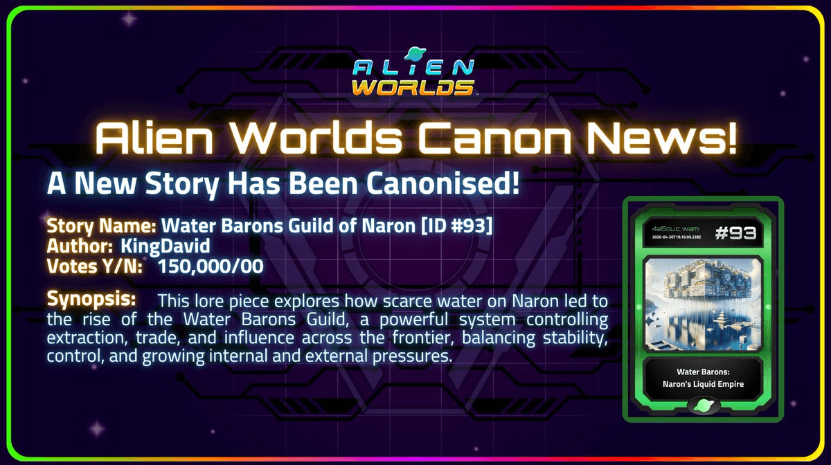 **Alien Worlds** has added new lore to its player-driven universe through a community-submitted story. **Echoes of Naron** by King David (also credited as David Smith) explores resource scarcity on the planet Naron, where water access determines power structures. The narrative examines how a controlling system emerged to manage water distribution, trade, and political influence across the frontier. The story introduces **Water Barons** who control reserves while concealing secrets connected to Trilium that could affect galactic power dynamics. - Players can read the full story on [GitHub](https://github.com/Alien-Worlds/the-lore/pull/93/commits/a023991fcb8582f049ec15503ced38f62741cca7) - The lore has been officially ratified into the Alien Worlds universe - Community members can submit their own stories or vote on submissions at [play.alienworlds.io/lore](https://play.alienworlds.io/lore) This represents Alien Worlds' ongoing tokenized lore system, where players contribute to worldbuilding through DAO governance.