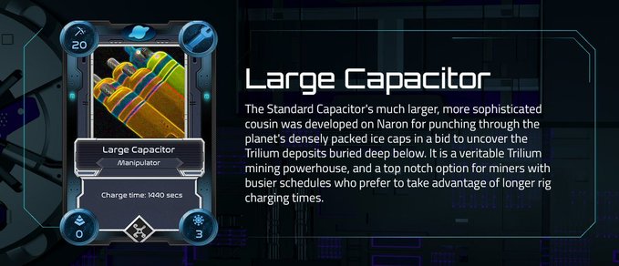 Large Capacitor: Developed on Naron to penetrate dense ice caps, this advanced tool uncovers deep #Trilium deposits. Ideal for miners with busy schedules, it offers longer rig charging times and powerful mining capabilities, making it a top choice for efficient mining.