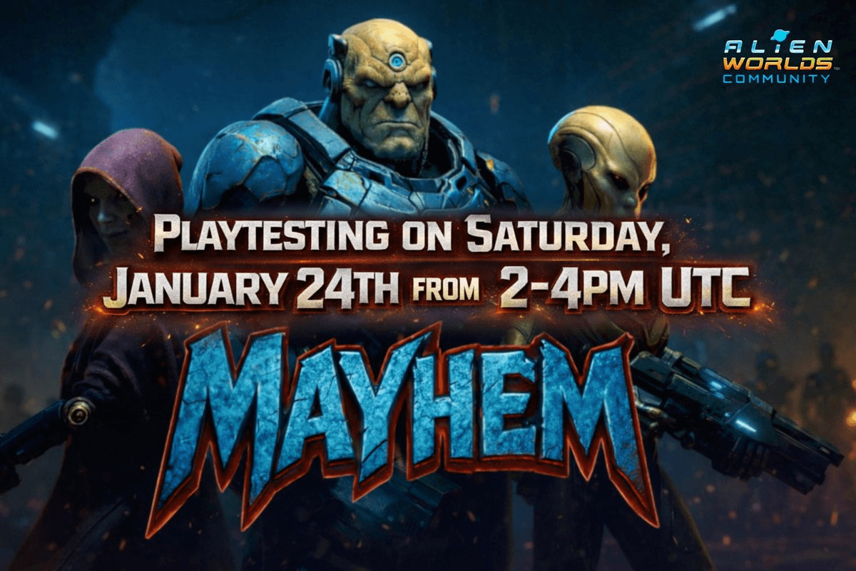 **Mayhem: Alien Worlds** launches its second round of PvP playtesting on January 24. The turn-based tactical shooter, built on Alien Worlds lore, offers players another opportunity to compete in live matches and earn rewards. **How to participate:** - Download Mayhem on [Android or iOS](https://alienworlds.io/blogs/getting-started-in-mayhem-alien-worlds%20/) - Play PvP during the playtest window - Record your best kill shot - Post on X using #MayhemAlienWorlds - Complete the [Google form](https://forms.gle/UXJKQHHJwwSUeApJ7) **Rewards:** - First 20 valid posts earn 5,000 TLM each - All valid entries count toward Round 2 rewards CryptoStache released a [new video](https://youtu.be/PkkR1UBAxlI) showcasing gameplay and competition details.