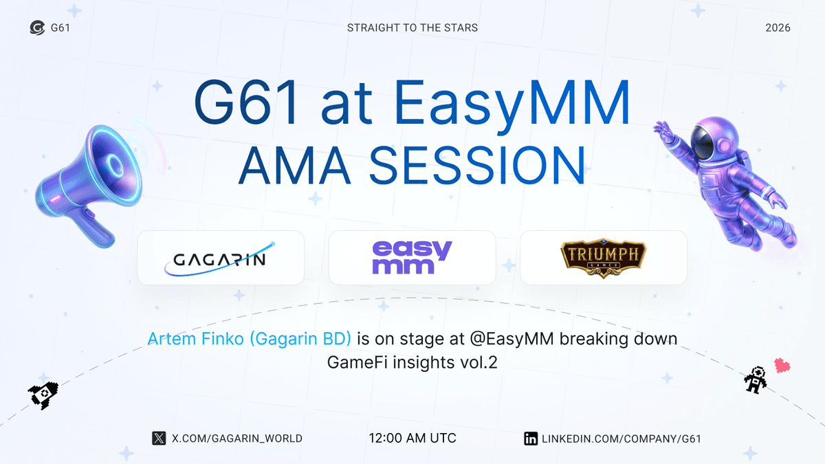 **GameFi Alpha Vol.2 AMA** scheduled for February 4th at 12:00 UTC addresses critical issues in blockchain gaming. **Panel Discussion Topics:** - Why GameFi projects consistently fail - Effective marketing strategies for actual gamers - Triumph Games ecosystem breakdown - GameFi's evolution trajectory in 2026 **Featured Speakers:** - Artem Finko (Gagarin BD) - Daniil Kozin (EasyMM) - Matthew Nagy (Triumph Games) This follows a January 30th session where Finko discussed how most GameFi projects misunderstand their audience, using Sands of Avalon as a case study for different approaches. [Join the discussion](https://x.com/EasyMM_official/status/2018681515824365969?s=20) and submit questions.