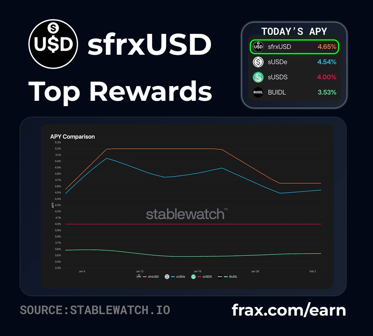 Frax Finance is promoting **sfrxUSD** as a reliable yield option during volatile market conditions. **Key Points:** - sfrxUSD designed to offer optimal risk-adjusted stable yield on-chain - Consistently outperforms APY of major competing stablecoin options - Backed by team with 5-year security track record - Positioned as "set-it-and-forget-it" savings solution The protocol emphasizes sfrxUSD's performance track record as markets experience turbulence. Users can access the yield product at [frax.com/earn](http://frax.com/earn). Frax continues to differentiate its yield-bearing stablecoin in an increasingly crowded market of similar products, focusing on security and consistent returns rather than maximum APY.