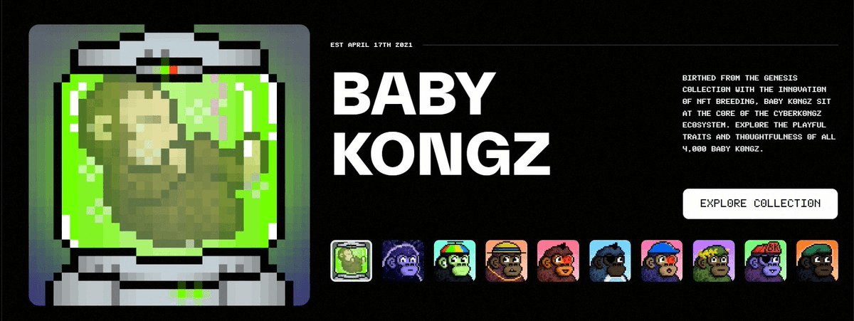 CyberKongz has introduced Baby Kongz, a collection of 4,000 NFTs created through an NFT breeding mechanism from their Genesis collection. **Key Details:** - Baby Kongz serve as a core component of the CyberKongz ecosystem - The collection features playful traits across all 4,000 pieces - Created through NFT breeding innovation from the original Genesis collection More information about the collection is available at [cyberkongz.com/collections](https://cyberkongz.com/collections)