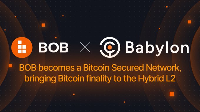 Introducing BOB as a Bitcoin Secured Network (BSN). Through our integration with @babylonlabs_io, we’re bringing Bitcoin finality to the Hybrid L2 and making @build_on_bob the best place to use BTC Liquid Staking Tokens (LSTs). blog.gobob.xyz/posts/bob-inte…
