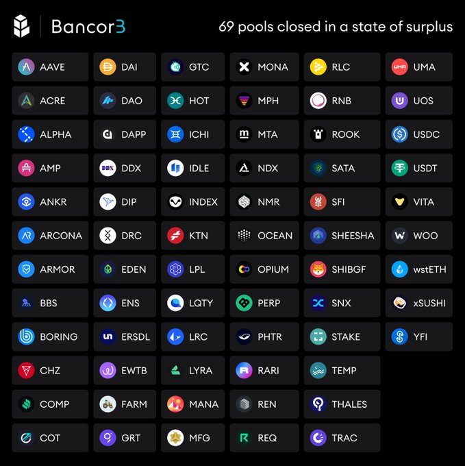 Bancor3 Progress Update: The Bancor DAO and its community have made significant headway on multiple efforts resulting in the following 10 pools being closed in a state of surplus: USDC, USDT, wstETH, AAVE, WOO, ANKR, UOS, REQ, CHZ, MONA - so far this month. This brings the total