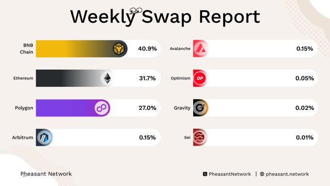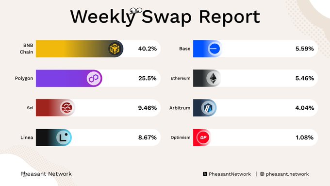 **BNB Chain leads weekly swap activity** across blockchain networks, according to the latest Pheasant Network report. **Top performers include:** - 🥇 BNB Chain - 🥈 Ethereum - 🥉 Polygon - ✨ Arbitrum - 🔥 Avalanche - 🍀 Optimism - 🚀 Gravity The report highlights **strong competition** among established networks, with several chains missing the top 7 rankings despite growing activity. Pheasant Network continues tracking cross-chain activity with their motto: *"Always cross-chain, one network!"*