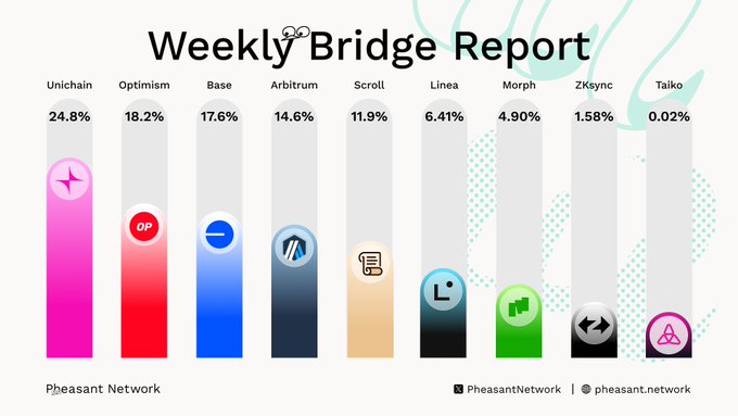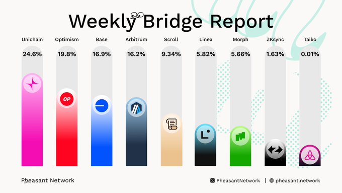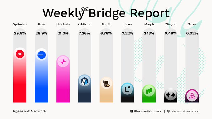 GMeasant, last week’s Bridge report📝 🥇Unichain @unichain 🥈Base @base 🥉Optimism @Optimism ✨Morph @MorphLayer 🔥Arbitrum @arbitrum Missed out on the top 5, but last week was remarkable for Linea @LineaBuild 📣 Be optimistic, with Pheasant!
