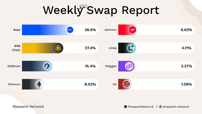 GMeasant, last week’s Swap report📝 🥇Base @base 🥈BNB Chain @BNBCHAIN 🥉Arbitrum @arbitrum ✨Ethereum @ethereum 🔥Optimism @Optimism ☘️Linea @LineaBuild 🚀Polygon @0xPolygon Missed the top 7, there are plenty of other up-and-coming networks🐦🪽 Always cross-chain, one
