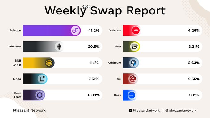 GMeasant, last week’s Swap report📝 🥇Polygon @0xPolygon 🥈Ethereum @ethereum 🥉BNB Chain @BNBCHAIN ✨Linea @LineaBuild 🔥Moonbeam @MoonbeamNetwork ☘️Optimism @Optimism 🚀Blast @blast Missed the top 7, there are plenty of other up-and-coming networks🐦🪽 Always cross-chain,