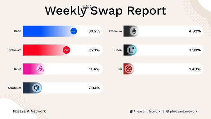 GMeasant, last week’s Swap report📝 🥇Base @base 🥈Optimism @Optimism 🥉Taiko @taikoxyz ✨Arbitrum @arbitrum 🔥Ethereum @ethereum ☘️Linea @LineaBuild 🚀Sei @SeiNetwork Missed the top 7, there are plenty of other up-and-coming networks🐦🪽 Always cross-chain, one network!