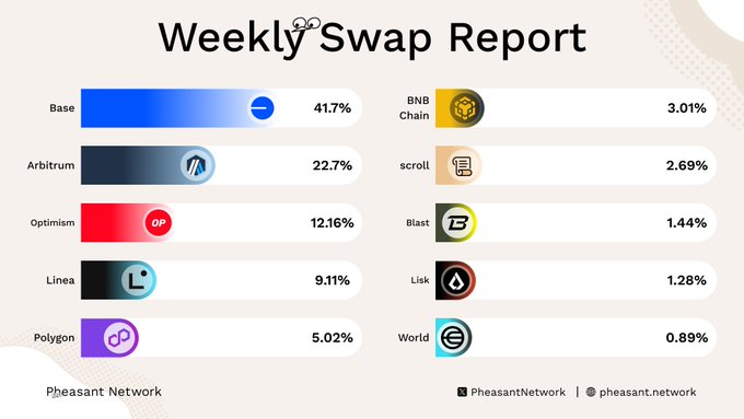 Base continues to lead weekly swap volume, maintaining its position from previous weeks.​ The latest rankings show: