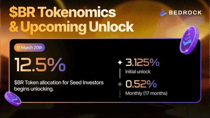 Bedrock also disclosed that its seed investor cliff concludes this month, with 3.125% unlocking initially, followed by 0.52% monthly releases over 17 months.