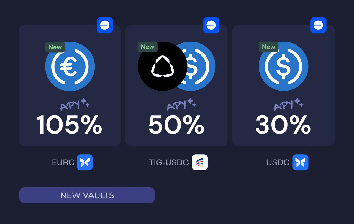 Base network is currently offering exceptionally high yields on stablecoins: - **EURC**: 105% APY - **TIG-USDC pair**: 50% APY - **USDC**: 30% APY These rates represent a significant increase from previous periods when Base USDC yields were around 15%. The elevated returns come as Base's total value locked (TVL) continues to grow, with the network distributing approximately 8x more reward points per dollar deposited compared to competing chains like Arbitrum.
