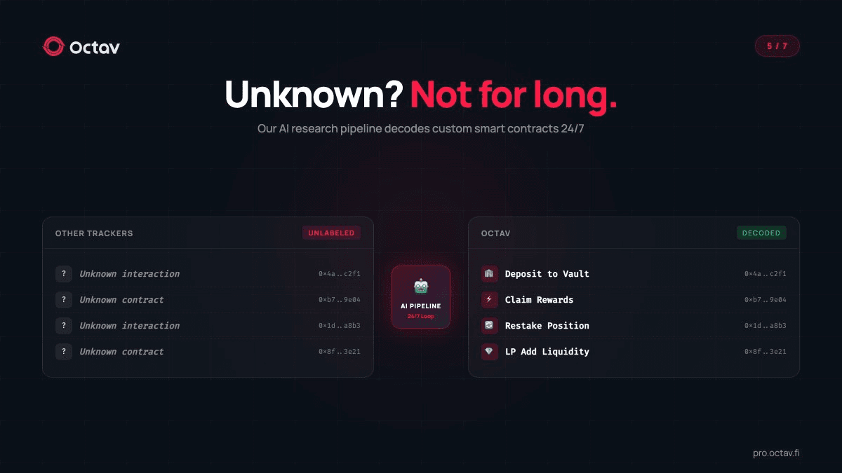 A new AI research pipeline operates continuously to decode and classify previously unidentified smart contracts and niche protocols. **Key capabilities:** - Runs 24/7 to analyze custom and unknown contracts - Automatically labels interactions that were previously marked as "Unknown" - Provides pricing and tracking data for decoded contracts **Context:** This builds on recent infrastructure developments where indexed datasets on The Graph Network became accessible to AI agents through plain English queries, eliminating the need for custom integration code. The system addresses a common pain point in blockchain analytics where interactions with new or custom contracts often appear as unidentified transactions, making it difficult to track and understand on-chain activity.