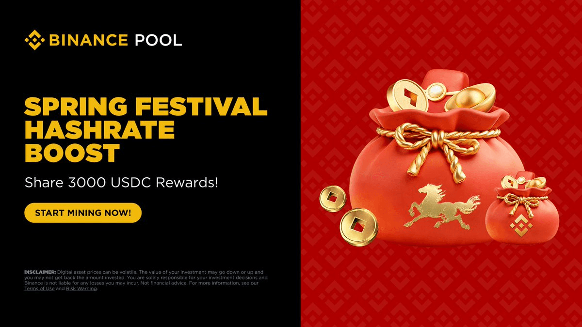 Binance Pool is running a Spring Festival promotion for Bitcoin miners. **Key Details:** - Miners can share up to 3,000 USDC in rewards - Rewards are tied to increasing BTC hashrate on Binance Pool - Promotion coincides with Spring Festival timing This follows Binance's previous Super Mine campaign from October, which offered token vouchers and hashrate boosts. The exchange continues its pattern of seasonal mining incentives to attract hashrate to its pool. [Full details available here](https://www.binance.com/en/support/announcement/detail/a8e0bc19c7a847f98c60e9f7b9597866?ref=AZTKZ9XS&utm_source=BinanceTwitter&utm_medium=GlobalSocial&utm_campaign=GlobalSocial)