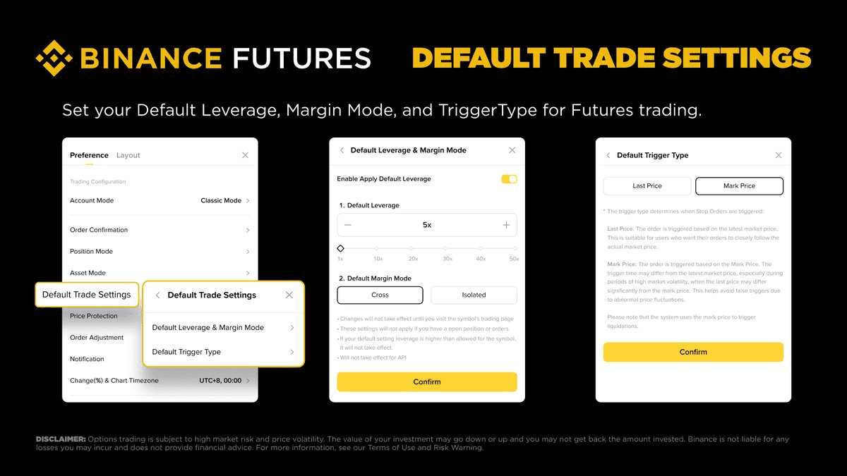 Binance has introduced new customization options for Futures traders on both web and mobile platforms. **Key Features:** - Set default leverage levels across all trading pairs - Choose preferred margin mode (Cross or Isolated) - Configure default trigger types for orders These settings aim to streamline the trading process by eliminating the need to manually adjust parameters for each new position. Traders can access these preferences through the Futures settings menu. [Learn more about the new features](https://www.binance.com/en/support/faq/detail/360034946672)