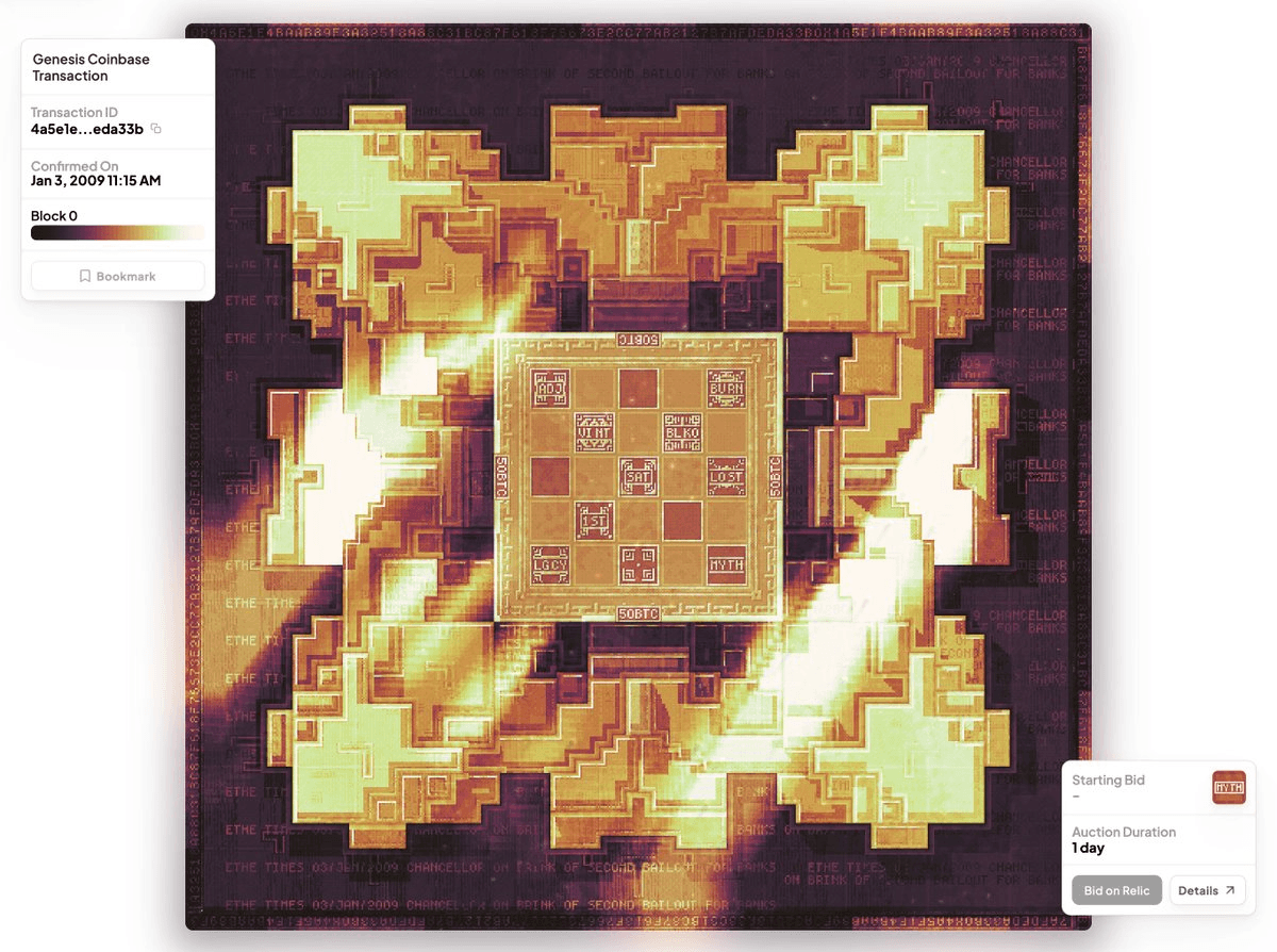 A new Bitcoin NFT collection called Relics introduces dynamic aging mechanics that mirror physical art's patina development. **Key Features:** - Each NFT ages annually on its transaction anniversary for 100 years - Visual appearance evolves year by year, accumulating digital patina - The genesis transaction (Bitcoin's oldest) leads the collection - One Relic has already developed 17 years of patina **The Concept:** The project assumes Bitcoin's longevity, designing artifacts meant to mature over a century. Like traditional art that gains character through time, these digital relics transform gradually, creating a living archive of Bitcoin's history. The collection captures blockchain moments - market sentiment, community reactions, and historical events - encoded into generative artworks derived from transaction data itself.