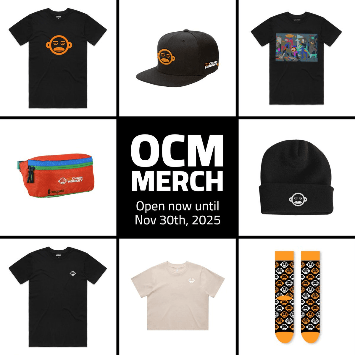 The **OnChain Monkeys (OCM) merch store** is now open for pre-orders through November 30th. **Key Details:** - Pre-orders available until Nov 30th - Delivery scheduled for December - Perfect timing for holiday gifts Community members can secure their OCM merchandise now to receive items in time for the December holidays. **Get your pre-orders in before the November 30th deadline.**