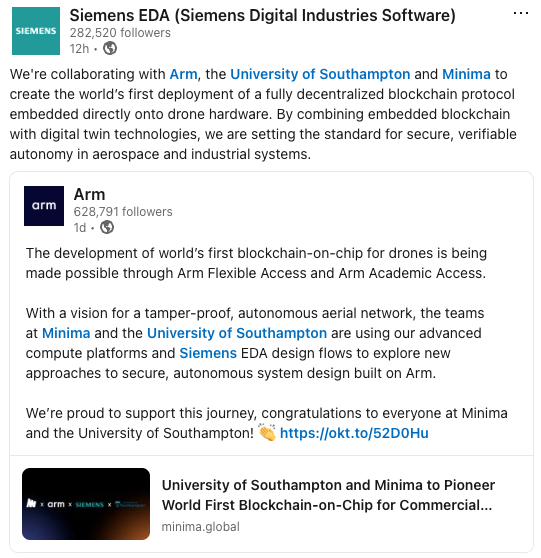 New milestone for Minima: in addition to @arm, weâre teaming up with @unisouthampton and @Siemens to pioneer the worldâs first blockchain-on-chip drones. This is where embedded blockchain meets real-world autonomy. Hereâs why it matters đ đ minima.global/post/universit⌠đ§ľ