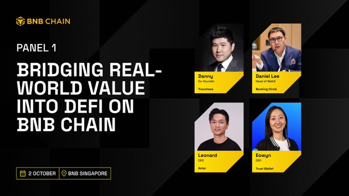 Real-World Assets ๐ค DeFi At #BNBSingapore, weโll dive into how RWAs on BNB Chain are reshaping markets and opening fresh opportunities for builders and investors. ๐ฃ๏ธ @Tranchess, @BankingCircle, @Aster_DEX & @TrustWallet Join us on Oct 2 ๐ luma.com/uffjwg1m
