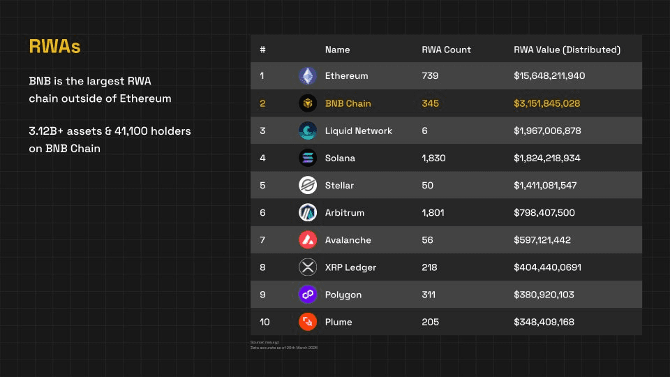 BNB Chain is establishing itself as more than just an issuance platform for real-world assets (RWAs), focusing on distribution as the key factor for their utility. **Current State:** - $3B+ in RWAs on the platform - 345+ asset types available - 41K+ holders participating - Partnerships with major institutions including BlackRock and Franklin Templeton **Key Insight:** While issuance brought RWAs onchain, distribution through DeFi, trading, and other applications determines their actual purpose and future trajectory. Tokenized stocks are already seeing real trading activity, with most volume occurring on BNB Chain. The platform positions itself as both infrastructure partner and distribution layer, addressing the gap between simply creating tokenized assets and making them useful in the broader ecosystem. [Full recap available here](https://www.bnbchain.org/en/blog/bnb-chain-at-digital-asset-summit-nyc)