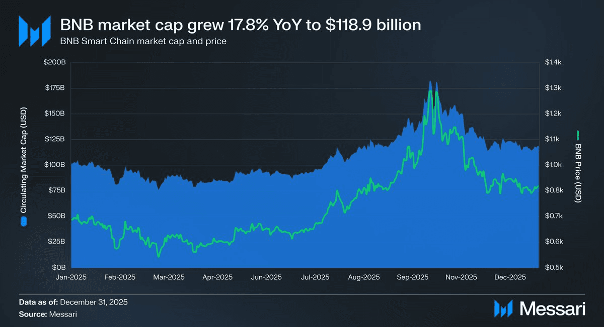 BNB Chain demonstrated solid performance throughout 2025, according to Messari's Q4 report. The blockchain showed measurable growth across several key areas: - **Real usage expansion** in DeFi, real-world assets (RWAs), and payment applications - **Institutional capital** flowing into the ecosystem - **Infrastructure scaling** to support sustained onchain activity The data from Messari indicates BNB Chain closed the year with strong fundamentals and clear traction in core use cases. The network is positioning itself for continued growth as it enters 2026, with infrastructure improvements designed to handle long-term activity. The report highlights that BNB Chain's growth is backed by concrete metrics rather than speculation, showing adoption across multiple sectors of the blockchain economy.