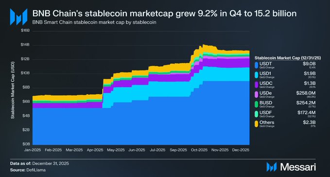 The stablecoin market on BNB Chain grew 9.2% quarter-over-quarter to reach $15.2 billion, with USDT and USDC leading the expansion.