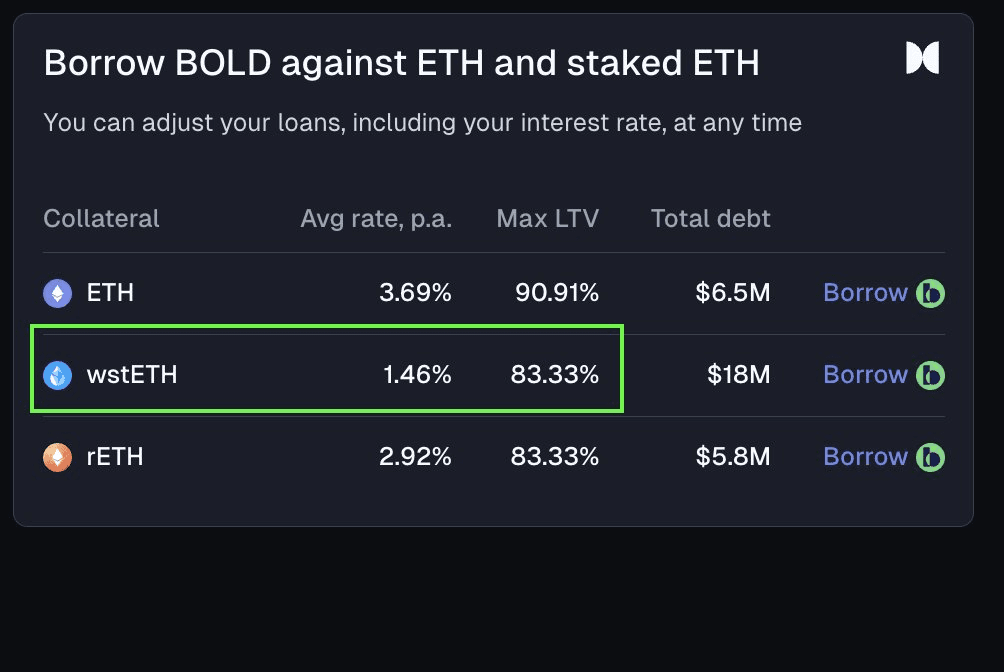 **Liquity V2 introduces unprecedented borrowing economics** with a 1.46% rate on wstETH collateral - 2% lower than competing platforms. **Key advantages:** - Fixed, non-volatile interest rates - Collateral remains in user custody (not lent out) - Transparent pricing without overpayment - Up to 91% loan-to-value ratio with ETH **One-click migration** available for DeFiSaver users looking to optimize their borrowing costs. The platform maintains its position as DeFi's lowest-cost borrowing venue, with 1-year average rates running 2% below competitors. This makes it particularly attractive for treasuries seeking runway without liquidating ETH holdings. [Borrow on Liquity](https://liquity.app/borrow)