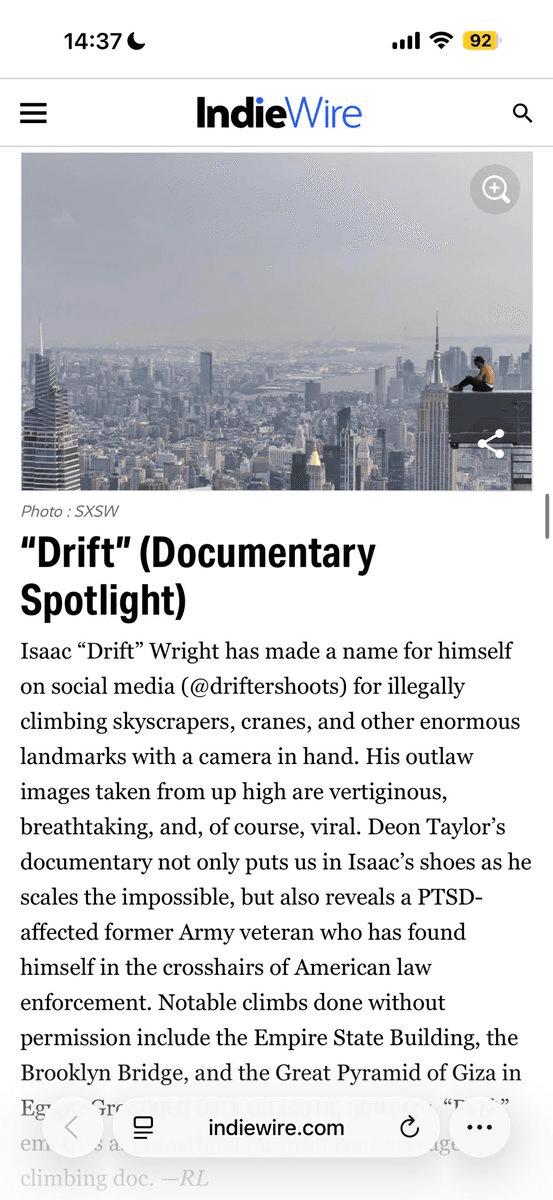**Major Recognition at SXSW** Indie Wire has selected *Drift* as one of the top 15 films to watch at SXSW, chosen from a competitive field of 300 films. This recognition marks a significant milestone for the project. **What's Next** - Additional screenings scheduled during the festival - More announcements planned post-SXSW - Updates available on Instagram and through community channels The selection by Indie Wire positions *Drift* among the festival's most anticipated works, bringing increased visibility to the project and its creative vision.