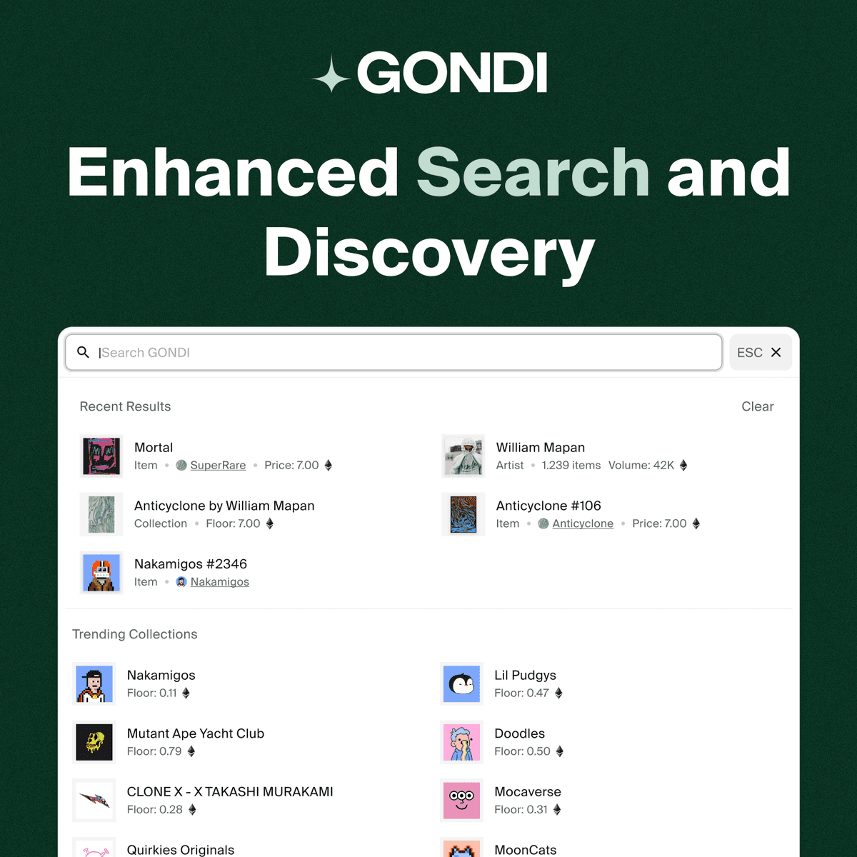 GONDI has launched a major search upgrade focused on speed and discovery. **Key improvements:** - Trending collections and artists appear immediately on open - Prices, volume, and stats visible on every search result - Typo-tolerant search that works with close matches - Full ENS and vault name support - Faster performance across the platform - Collections sorted by ascending price when results tie The update aims to help users find NFTs more efficiently as market conditions shift quickly.