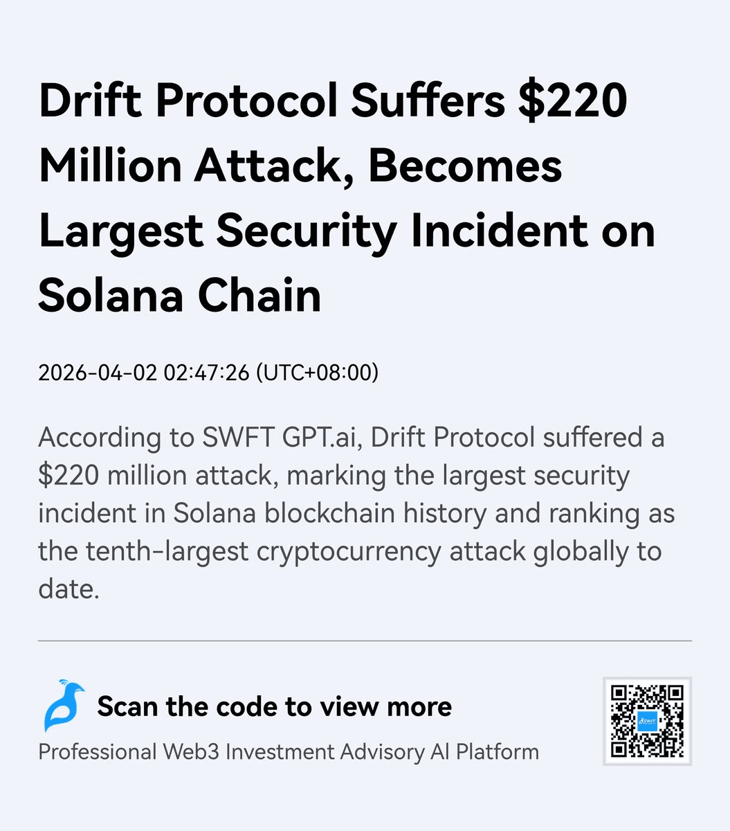 **Solana-based perpetuals DEX Drift Protocol has been exploited**, resulting in losses exceeding $200 million. The security breach represents a significant incident in the DeFi space, affecting a substantial amount of user funds on the platform. **Key Details:** - Platform affected: Drift Protocol (Solana-based perpetuals exchange) - Estimated losses: More than $200 million - Type of incident: Security exploit The situation is still developing as the protocol and community assess the full extent of the damage and potential recovery options.