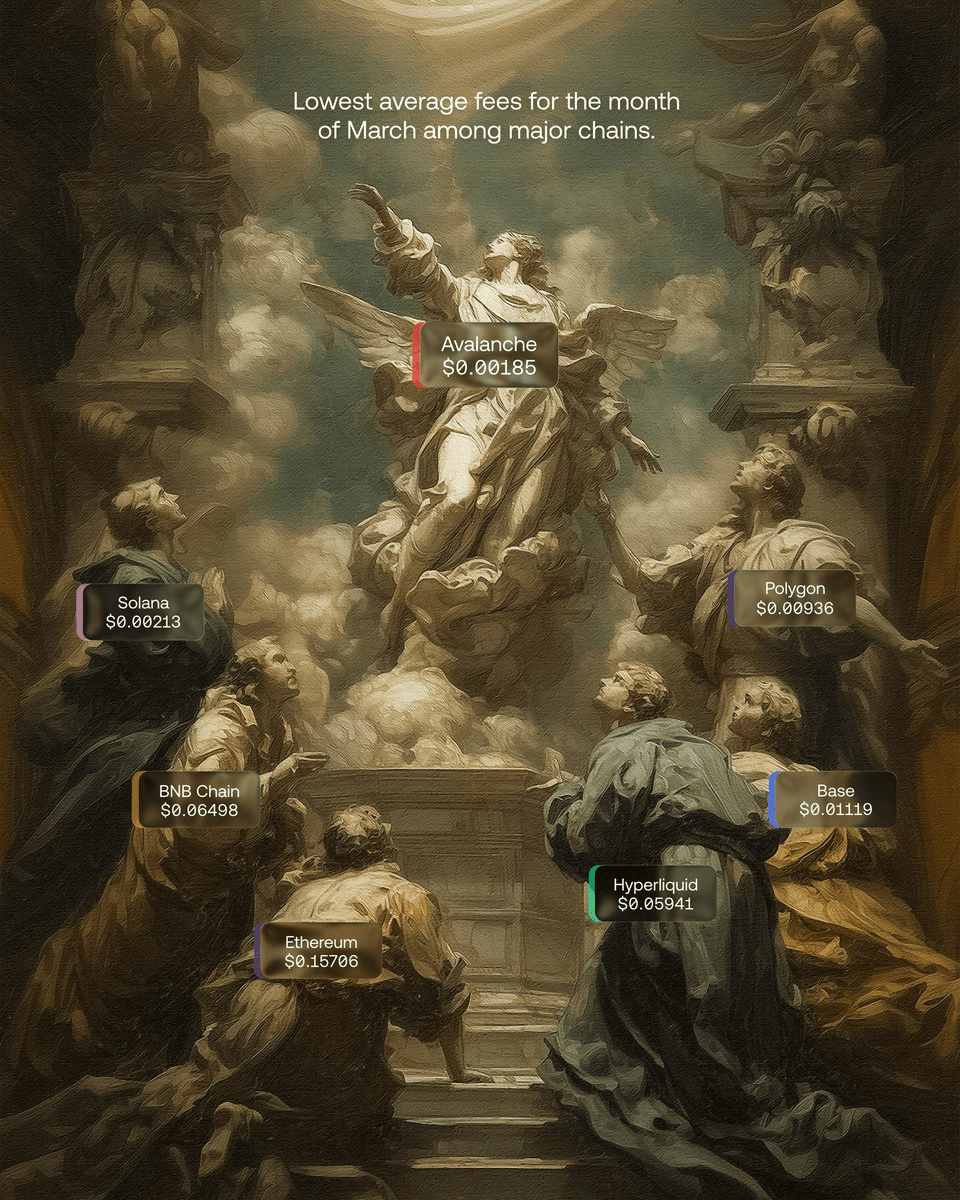 Avalanche has achieved the lowest average transaction fees among all major blockchain networks in March 2026. This milestone reinforces the network's position as a cost-effective platform for users and developers. The achievement builds on Avalanche's historical reputation for maintaining low fees and consistent performance. **Key highlights:** - Avalanche outperformed all major competing chains in transaction cost efficiency - Low fees continue to be a primary factor in attracting projects to the network - The network maintains its commitment to accessibility and affordability This development strengthens Avalanche's competitive advantage in the blockchain ecosystem, particularly for applications requiring frequent transactions where costs can significantly impact user experience.