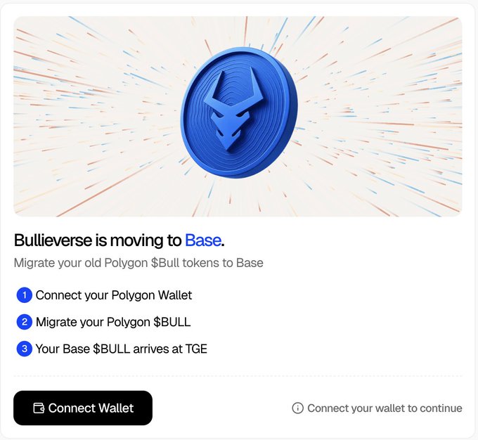 **BULL token holders voted overwhelmingly to migrate from Polygon to Base** The governance vote concluded with **98.79% approval** for the $BULL migration to Base network. **What's Next:** - Migration portal launching shortly - Connect Polygon wallet to view eligible conversion amount - Migrate tokens to $BullOnBase The vote followed a comprehensive process: - Final snapshot taken for token holders - Only $BULL holders could participate - 1 vote per 10,000 $BULL tokens held This migration represents a **major transition** for the Bullieverse ecosystem, moving from Polygon to Base network with new tokenomics designed to reward long-term holders.
