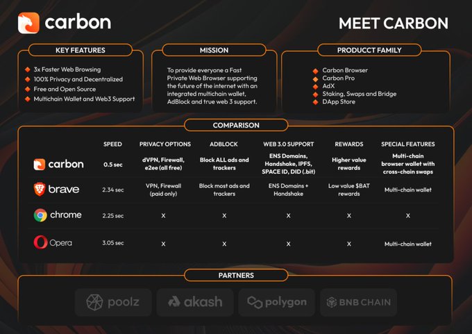 **Carbon Browser ($CSIX)** positions itself as the fastest browser built on BNB Chain, building on its previous claim as the only privacy-focused browser on the network. **Key highlights:** - Founded in 2016 with 7M+ downloads - 60K+ daily active users - Claims 3x faster performance - Enhanced privacy and decentralization features - Available across PC, Mac, Android, and iOS TestFlight The browser integrates a multi-chain wallet with cross-chain swap capabilities, targeting users seeking both speed and privacy in their web3 browsing experience.