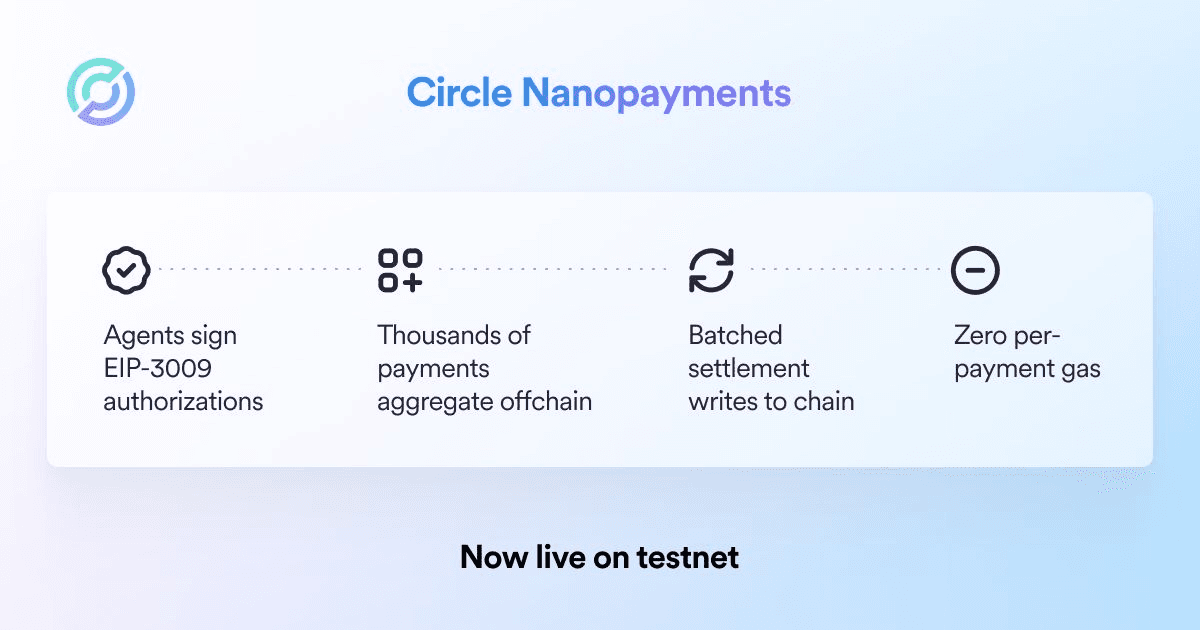**Circle Nanopayments** addresses a critical infrastructure gap for AI agent transactions by eliminating per-payment gas costs. **The Problem:** - Sub-cent payments fail when competing in traditional mempools - AI agents need to transact at fractions of a cent per API call, inference, or compute cycle - Traditional blockchain rails can't support this volume economically **The Solution:** - Agents sign **EIP-3009 authorizations** - Thousands of payments aggregate offchain - Batched settlement writes to chain - Zero gas cost per individual payment - Near-instant confirmation with onchain finality **Technical Details:** - Enables gas-free USDC transfers as small as **$0.000001** - Built on Circle Gateway - x402 compatible for agentic scale - Currently live on testnet This infrastructure supports emerging use cases like pay-per-call APIs, real-time compute billing, and machine-to-machine payments. By moving aggregation offchain while maintaining onchain settlement, Circle creates a financial rail designed specifically for autonomous agent economic activity. Learn more: [Circle Nanopayments](http://www.circle.com/blog/a-deep-dive-into-circle-nanopayments-gas-free-usdc-transfers)