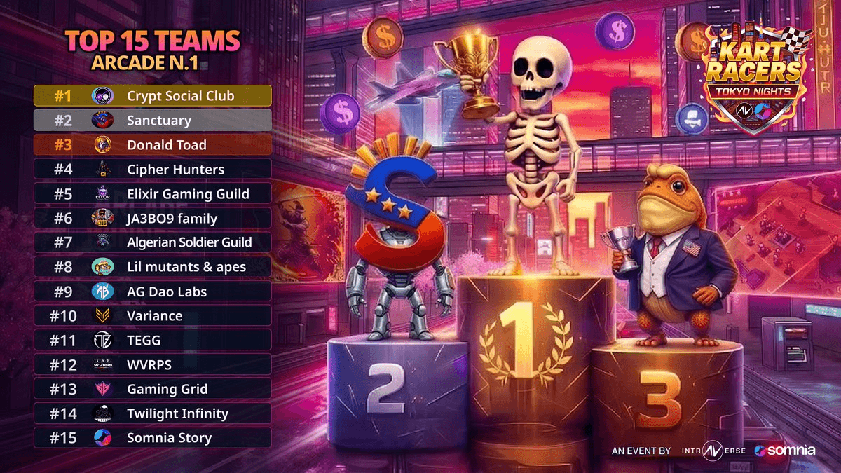 **Arcade Week #2 Competition Details** The second weekly arcade event of the Tokyo Nights season, powered by Somnia Games, begins March 20th. **Prize Pool & Schedule:** - $250 in liquid cash plus Intraverse Points (IPs) - Competition runs: March 20, 12PM UTC through March 22, 9PM UTC - Kart racing gameplay format **How to Participate:** Players can warm up through daily grinding sessions before the main event. Rankings will determine prize distribution among top teams and individual players. This follows the first weekly arcade which offered similar rewards: $250 for top teams and 200K IPs for leading players. The Tokyo Nights season features Midnight Keys - NFTs that unlock up to 200x reward multipliers across all integrated games. [Competition details](https://twitter.com/somniaGames_)