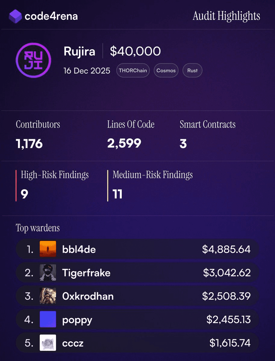 The $40,000 Rujira Network audit competition has concluded with @bbl4de_xyz claiming first place in their debut competition win. **Key Highlights:** - Multiple valid security findings submitted by participants - First-time competitor @bbl4de_xyz takes top honors - Rujira Network demonstrates commitment to security through competitive audit The competition follows Code4rena's recent $100,000 Swafe audit, where montecristo secured the only solo finding. Full winner details available in the announcement thread.