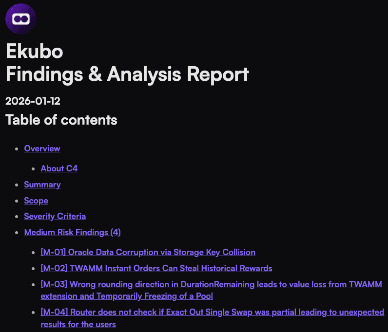 **Ekubo Protocol's comprehensive security audit report is now available** following a competitive audit competition that awarded $183,500 in prizes. **Key highlights:** - The audit was conducted through Code4rena's competitive security review process - Two researchers, @zzebra83 and @Jonah1005W, tied for first place - Multiple valid security findings were submitted and addressed - Full audit report is publicly accessible at [code4rena.com/reports/2025-11-ekubo](https://code4rena.com/reports/2025-11-ekubo) The completion of this audit demonstrates Ekubo's commitment to protocol security before deployment. Competitive audits allow multiple security researchers to review code simultaneously, often uncovering issues that traditional audits might miss.