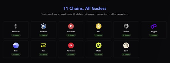 The platform supports major chains including Ethereum, Arbitrum, Optimism, Polygon, and Base. Users can trade without holding native gas tokens, making it particularly useful for stablecoin pairs.
