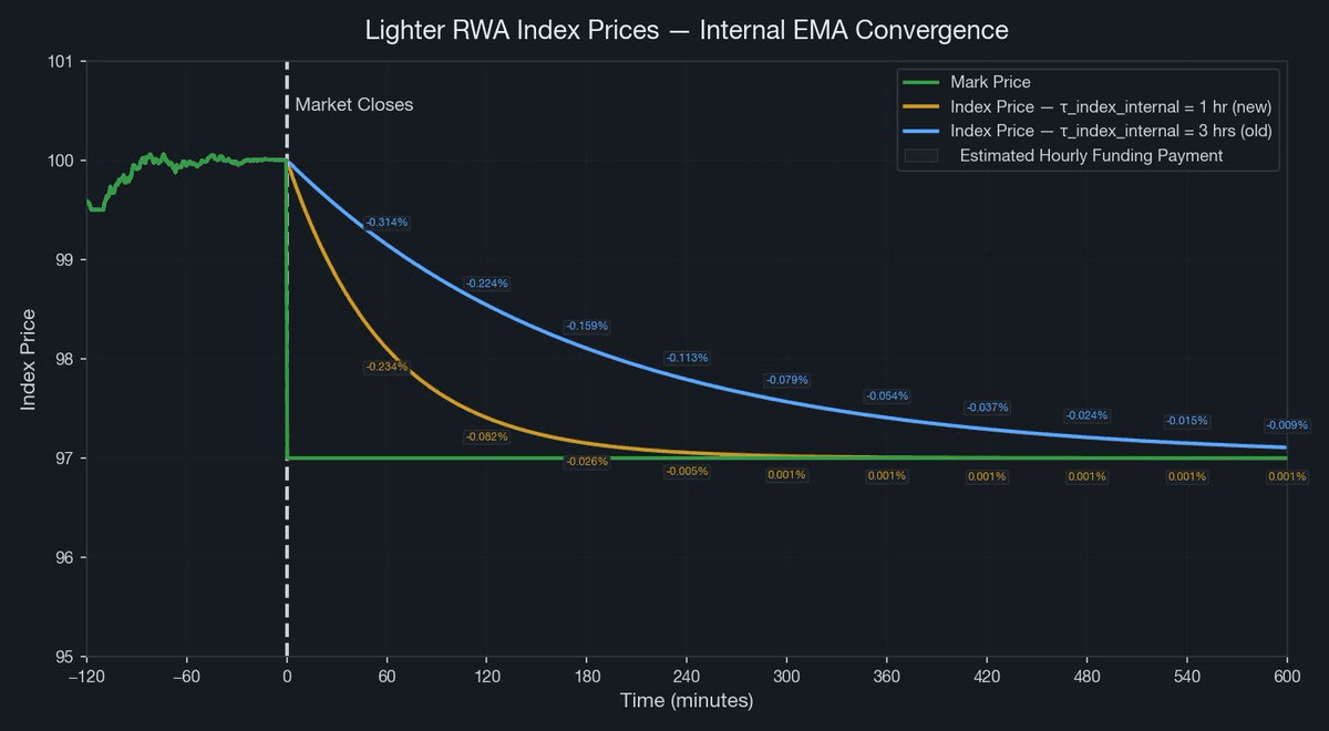 Lighter has updated its Real World Asset (RWA) trading parameters to improve market performance during traditional market closures. **Key Changes:** - Modified the parameter controlling the transition from external to internal pricing when traditional markets close - Aims to reduce funding rate volatility - Enhances price discovery mechanisms Lighter's RWA markets operate 24/7, providing continuous trading access even when traditional markets are offline.
